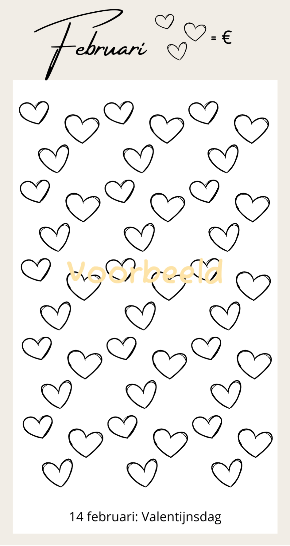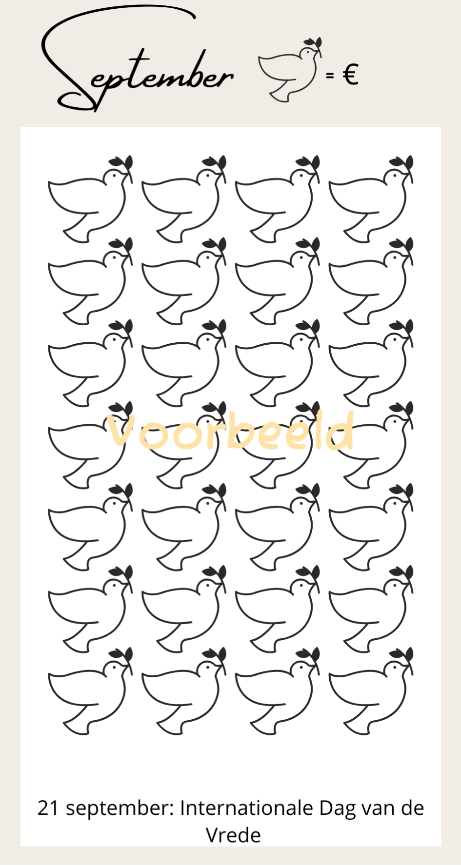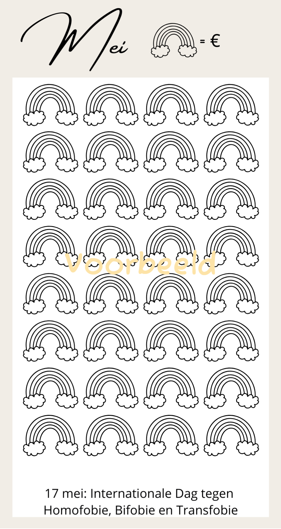 Elke maand heeft zijn eigen unieke, vrolijke illustratie die je kunt inkleuren zodra je weer een bedrag hebt gespaard. Jij bepaalt zelf hoeveel je per keer spaart – groot of klein, alles telt mee.