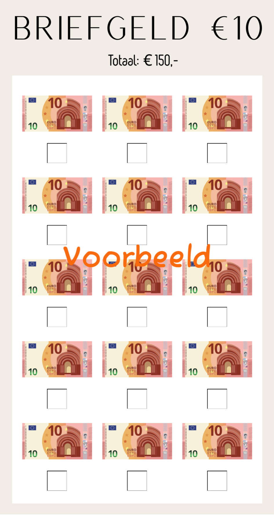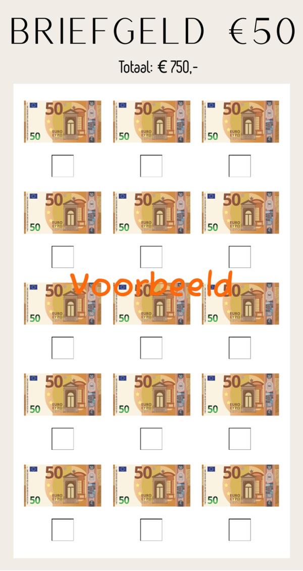 Gebruik briefjes van €5, €10, €20 of €50 en kruis bij elk gespaard bedrag een vierkantje af. Zo zie je in één oogopslag hoe ver je bent en blijf je gemotiveerd tot je jouw spaardoel hebt bereikt.
